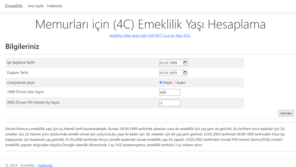 ASP.NET Core ile Memur Emeklilik Yaşı Hesaplama. Bu proje daha önce masaüstü için geliştirdiğim uygulamanın Asp.Net Core’a uyarlanmış halidir. Geliştirme idesi olarak VS Code kullandım.