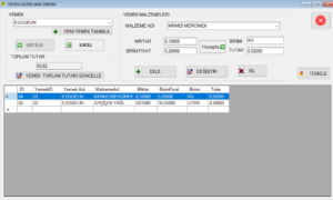 Yemek tanımlayıp yemekler oluşturabilirsiniz. Bu yemekleri ambar bölümündeki malzemeleri seçerek hazırlanır. Yemekten kullanılan malzemeler girilen yemeğe tanımlanmış olarak belirlenir.